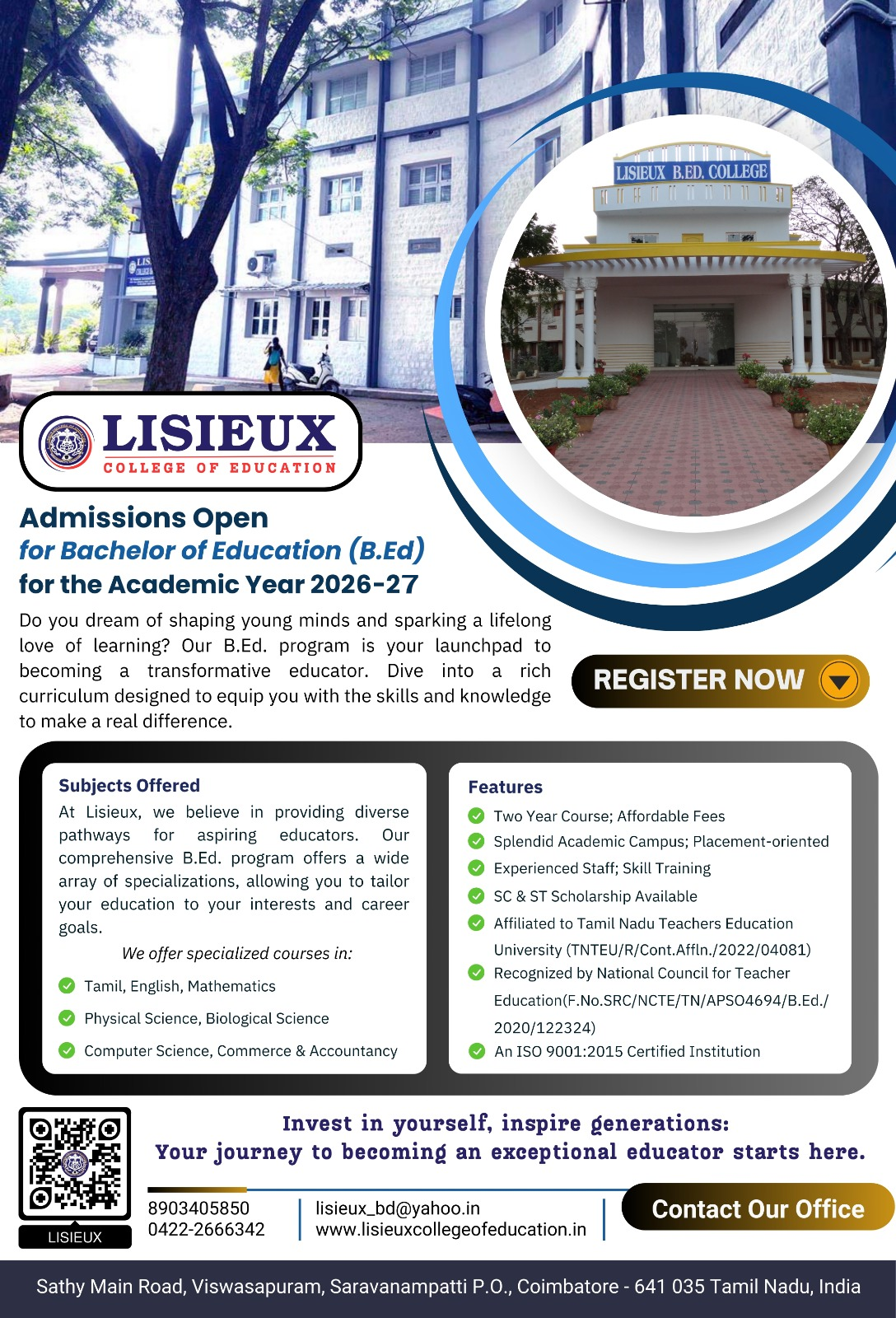 Lisieux College of Education, established in August 2007, is a premier institution dedicated to shaping future educators. It is managed by the Carmelites of Mary Immaculate (CMI) Education Society, Coimbatore, and forms an integral part of the extensive CMI network of educational institutions. Recognized by the National Council for Teacher Education (NCTE), the college is a Minority Community Educational Institution focused on training teachers for secondary and higher secondary schools. Initially affiliated with Bharathiar University, Coimbatore, the college is now affiliated with Tamil Nadu Teachers Education University (TNTEU), Chennai.